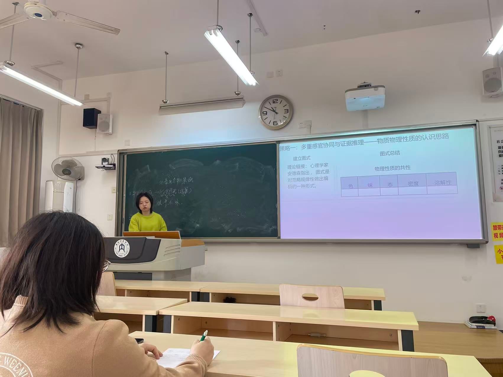 活动伊始,校级决赛选手朱佳琳老师依照决赛要求,完整呈现了参赛课程的课堂教学部分,并就教学目标、内容编排、教学方法、课堂互动等方面进行了详细阐述,展现出其扎实的教学基本功和积极备赛的态度。