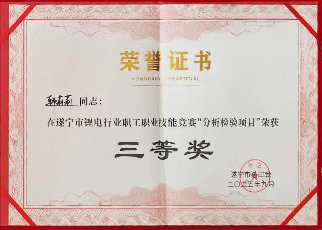 2025年9月24日,从遂宁市2025年锂电行业职工职业技能竞赛现场传来喜讯,我院2025届应用化学专业毕业生、现就职于四川翔丰华新能源材料有限公司的韩莉莉,在步入工作岗位仅两个月后,即代表企业参赛,并在竞争激烈的“分析检验项目”中荣获三等奖,充分展现了我院毕业生过硬的综合素质与扎实的实践能力。