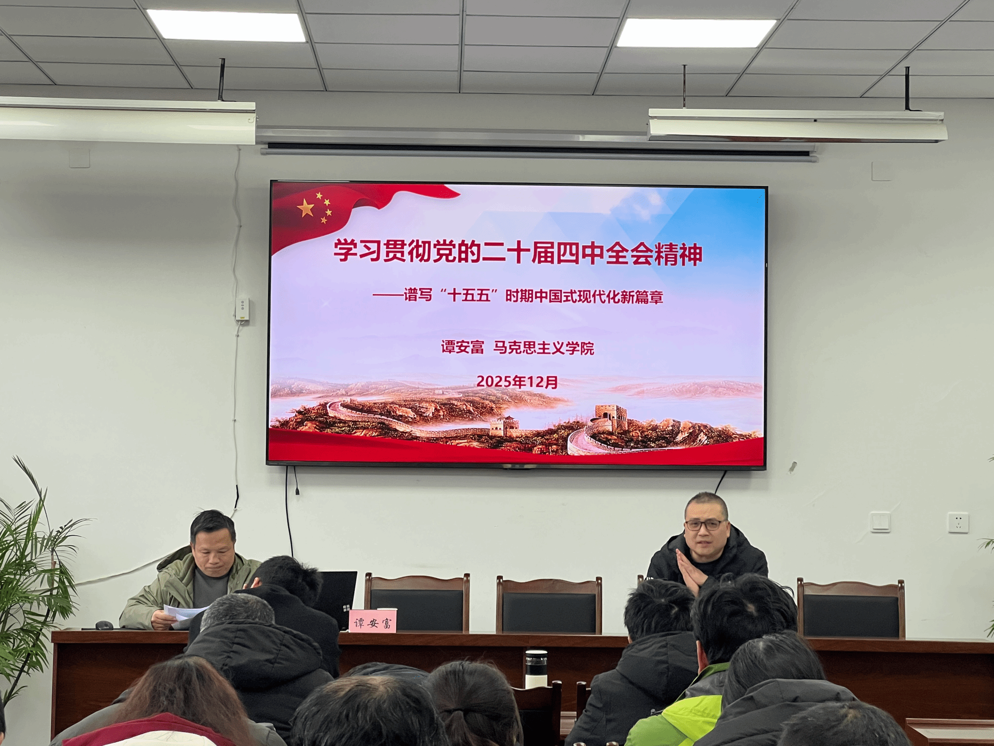 根据学校党委的统一部署和具体工作安排,为全面深入地学习贯彻党的二十届四中全会精神,切实提升全院教师的政治理论水平和思想认识高度。12月22日下午,学院特别邀请马克思主义学院党委副书记、院长谭安富同志,在学院102会议室开展了一场面对面专题宣讲活动。本次活动由学院党委书记刘勇主持,全院教师集体参会,认真聆听宣讲内容。