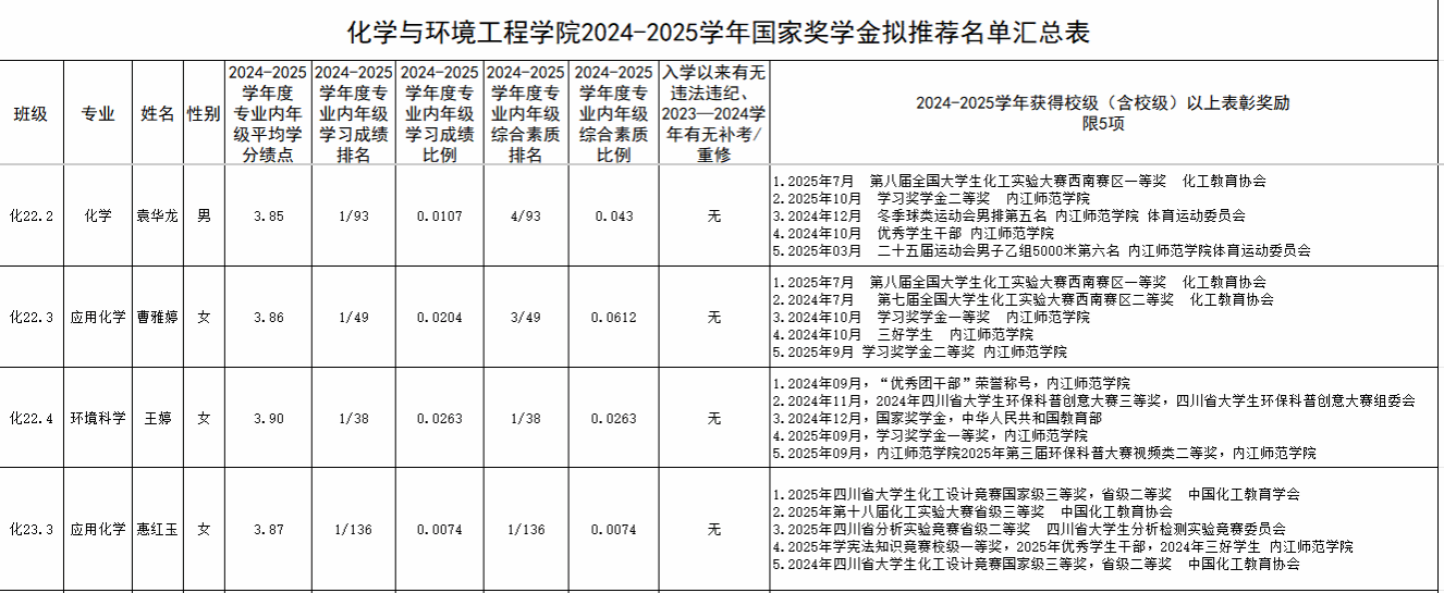 根据《内江师范学院关于做好2025年国家奖助学金评审工作的通知》要求,结合《四川省教育厅关于做好2025年高校国家奖助学金评审工作的通知》,本着公开公平公正的原则,院系采用专业内年级排名推荐,院系差额评选排序,最终拟推荐人员如下: